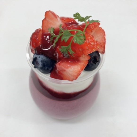 濃厚でジューシーなブルーベリーとカシスのパンナコッタに山盛りの苺とブルーベリー、さらに濃厚で甘酸っぱいベリーソースも合わせています。今の時期限定のベリーたっぷりのスィーツに仕上がっています❣