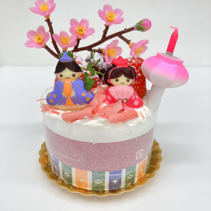 お雛様をイメージして♪旬の苺と甘さ控えめの生クリーム、コクのあるクレームパティシエールと苺をスポンジでサンド。ピンクの苺チョコレートと可愛いお雛様をデコレーションして🌸